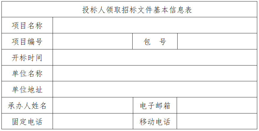 3、投标人领取招标文件基本信息表(填写下表后,以文件名为包号-设备名称-公司名称的文件发送至[email protected](邮箱名为医学装备管理处拼音首字母)