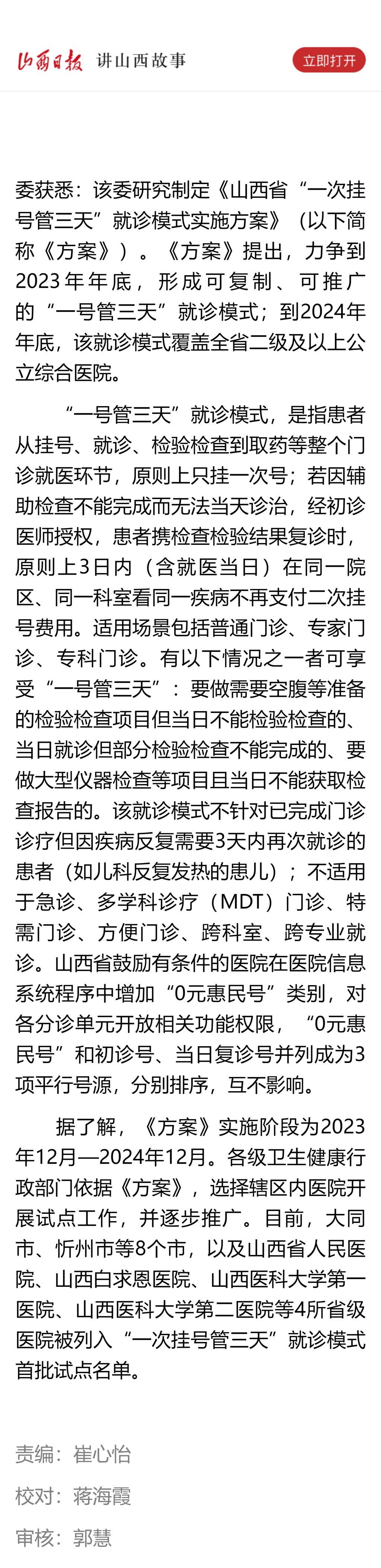 山西日报客户端|山西推行“一次挂号管三天”诊疗便民服务
