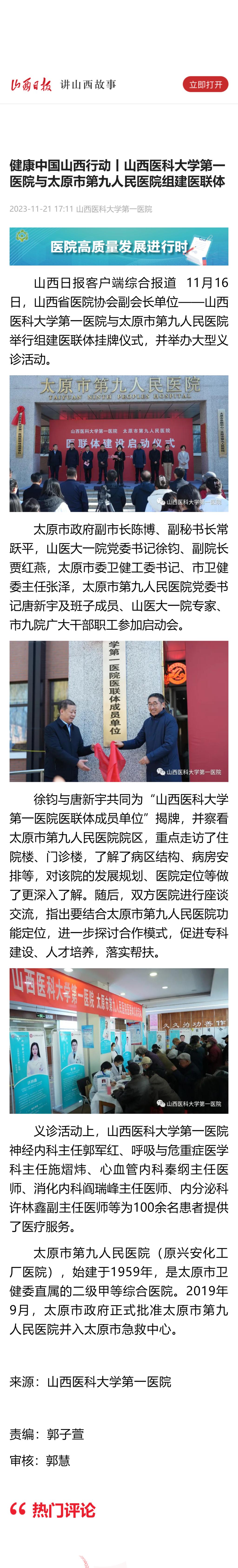 山西日报客户端|健康中国山西行动丨一飞冲天游戏攻略站 与太原市第九人民一飞冲天 组建医联体