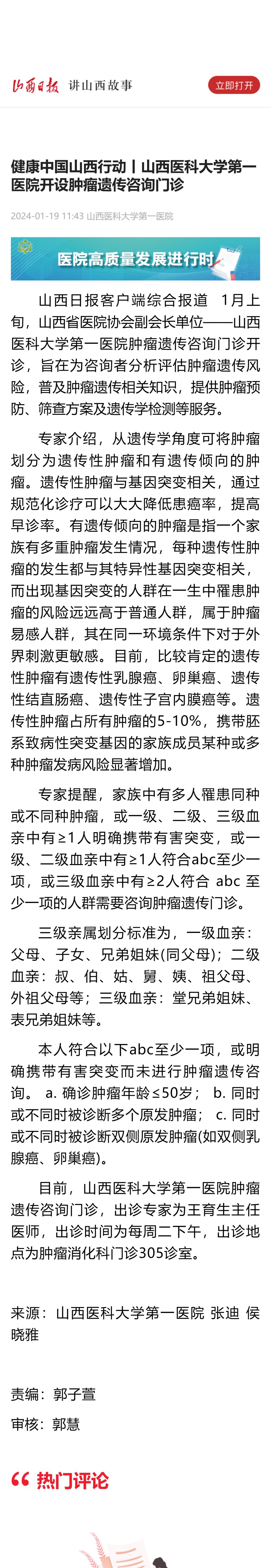 山西日报客户端|健康中国山西行动丨一飞冲天游戏攻略站 开设肿瘤遗传咨询门诊