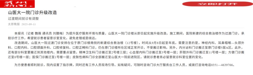 [太原晚报]山医大一院门诊升级改造 过渡期间就诊有调整