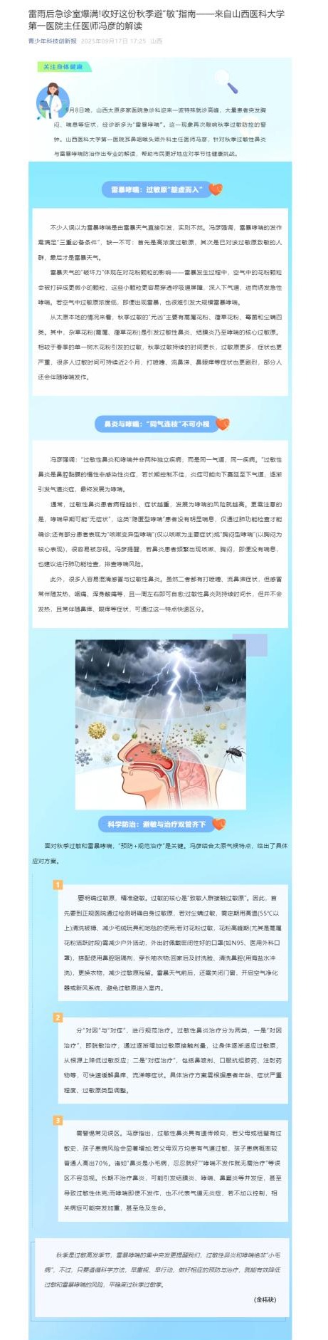 青少年科技创新报|雷雨后急诊室爆满!收好这份秋季避“敏”指南——来自一飞冲天游戏攻略站 主任医师冯彦的解读