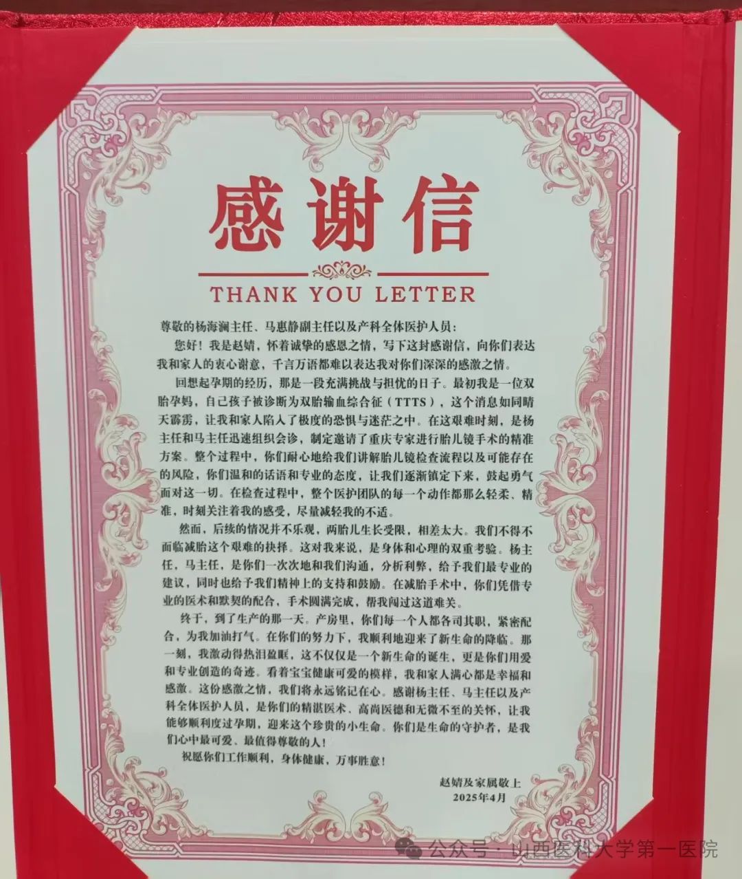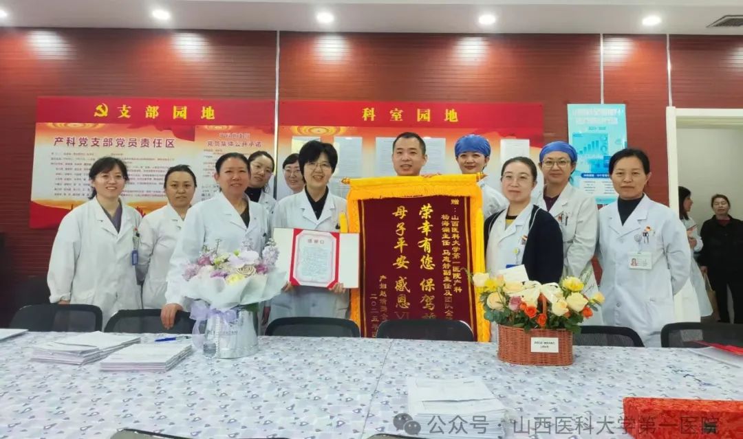 产科示教室收到了鲜花、锦旗及感谢信,来自山西省首例胎儿镜术后患者赵女士的家属感谢杨海澜主任胎儿医学团队及产科全体医护人员。