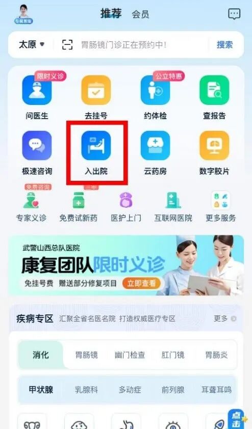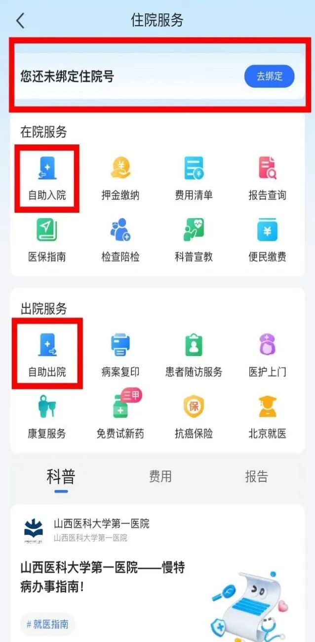 (1)健康山西APP—入出院—绑定住院号—自助入院/自助出院