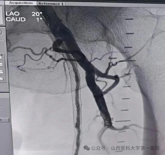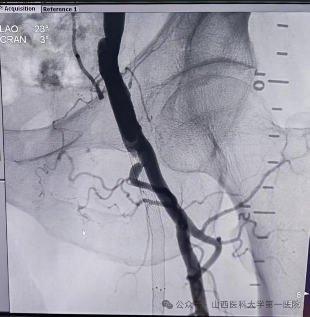 面对这一棘手病例,血管外科王贵明主任团队结合丰富的临床经验与国际前沿技术,制定出个体化、精准化治疗方案,采用先进的JETSTREAM外周血管斑块旋切导管系统实施微创介入治疗。术中在血管透视引导下,精准识别病变部位,通过导管高速旋转头端对支架内斑块及增生内膜进行粉碎,并依靠系统内置的螺旋输送装置将碎屑有效导出体外,术中同时发现支架远端为继发血栓形成,决定使用Rotarex机械血栓切除系统将远端血栓消除,并结合导丝头端通过病变的形态改变及触觉反馈,考虑支架内病变主要是内膜增生相关,决定使用药物球囊扩张技术,抑制内膜增生。此次手术彻底贯彻“leave nothing behind”治疗理念,相较传统导管溶栓或再次支架植入等治疗方式,在微创性、远期疗效及安全性方面均展现出显著优势。