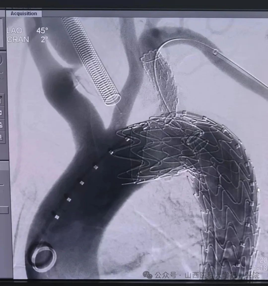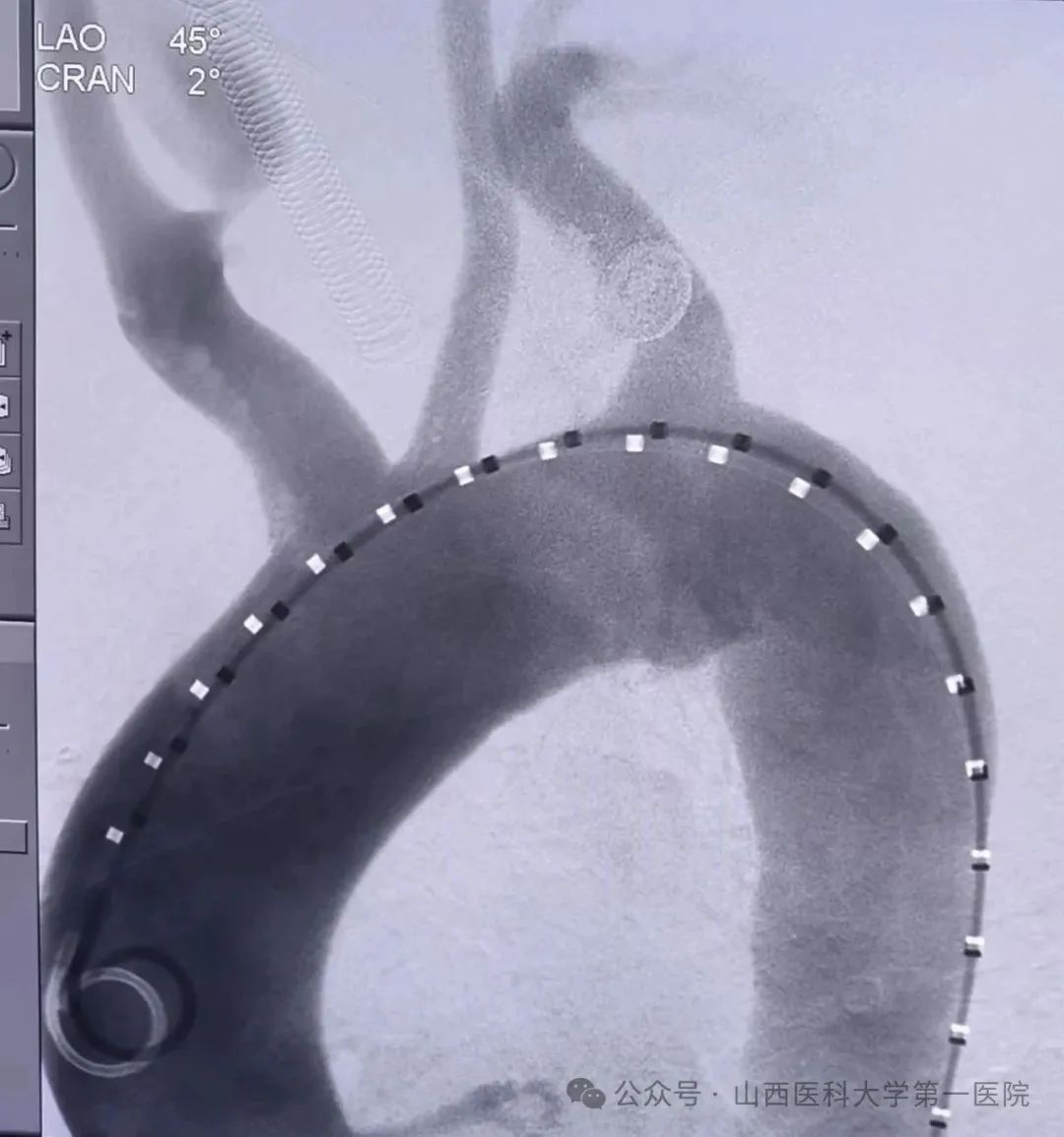 血管外科团队联合多学科会诊及精细术前评估后,决定为其实施目前国际先进的GORE分支型胸主动脉腹膜支架腔内隔绝术。该手术无需开胸,通过微创介入途径在主动脉腔内精确释放带分支的支架系统,同时重建左锁骨下动脉血流,这样既隔绝了穿透性溃疡,又保留左锁骨下动脉正常血流,同时降低了内漏的发生。