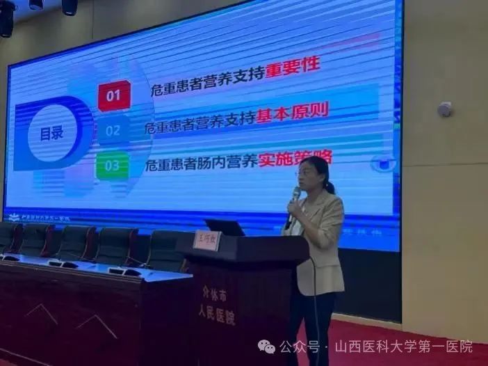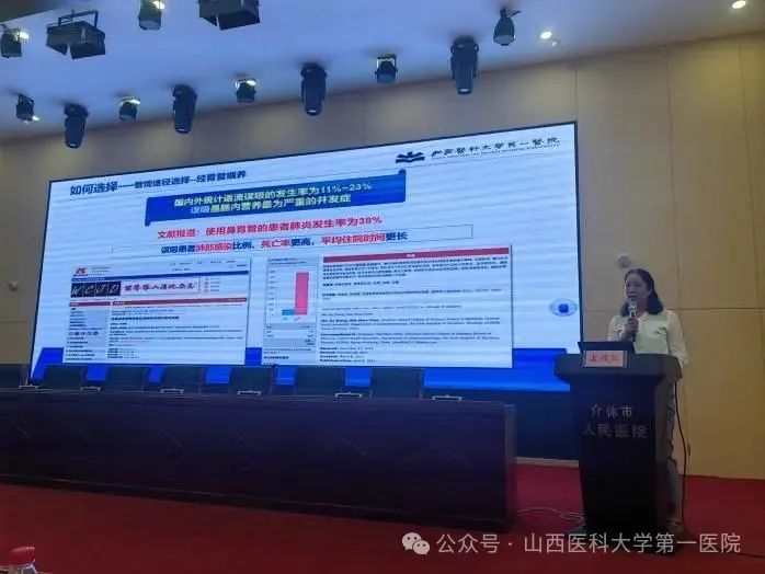 专题讲座部分,山医大一院重症医学科护士长王巧红以“重症患者肠内营养实施策略”为题,结合临床实际案例讲解了营养评估、个体化营养方案制定与动态调整策略;神经内科护士长郝彬围绕“肠内营养并发症的预防性护理策略”,系统解析了误吸、腹泻、堵管等的发生机制、识别方法及预防措施,强调“防大于治”的护理理念;神经外科护士长孟效红就“鼻空肠管置管路径选择与精准定位策略”进行分享,介绍了不同置管方式的适应症与操作技巧,重点演示了螺旋型鼻空肠管规范置管流程、操作要点、定位验证技术(包括X线、pH值和超声)及置管后的管理要点。