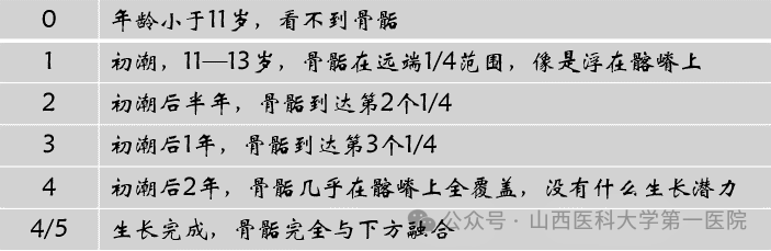 Risser描述了冠状髂骨骨骺由髂前上棘向髂后上嵴延伸并骨化的过程,一般骨骼发育成熟时该骨骺已与髂骨融合。Risser分级将髂骨骨化的过程分为五个阶段: Risser征0级:没有骨化;1级:周围25%骨化;2级:周围50%骨化;3级:周围75%骨化;4级:整个髂骨骨骺骨化,但是未与髂骨融合;5级:髂骨骨骺与髂骨融合。Risser分级系统在脊柱侧凸病人的X线片上可以方便地使用,因为髂骨骨骺包括在站立位片范围内。矢状面有较明显的骨盆倾斜的病人不易看到髂骨骨骺。对于女孩,从骨化出现到发展至 Risser征4级的平均时间为1年,到Risser征4级时生长潜能较低。而对于男孩,用 Risser征来反映骨骼成熟度则不如女孩可靠,因为男孩髂骨骨骺的骨化过程相对女孩较慢,即使发展至 Risser征4级,往往还能有明显的生长。Risser越大,骨成熟度越高,越不易矫正;Risser越小,骨成熟度越低,恶化风险越高。