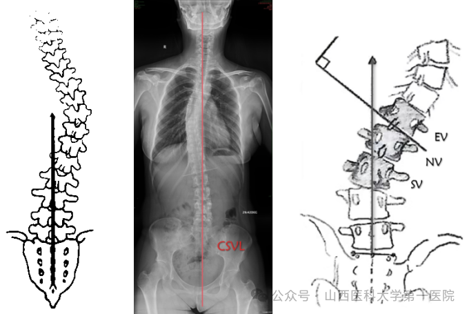 C7垂线是C7椎体中心垂直向下的直线,与X线片垂直边缘平行。通过测量C7垂直线与S1(CSVL)中心垂线之间的横向距离,可以确定冠状面的平衡。C7PL-CSVL代表C7PL和CSVL的水平间距。C7PL位于CSVL右侧为正值,左侧为负值,C7PL-CSVL>2cm定义为冠状面失衡。